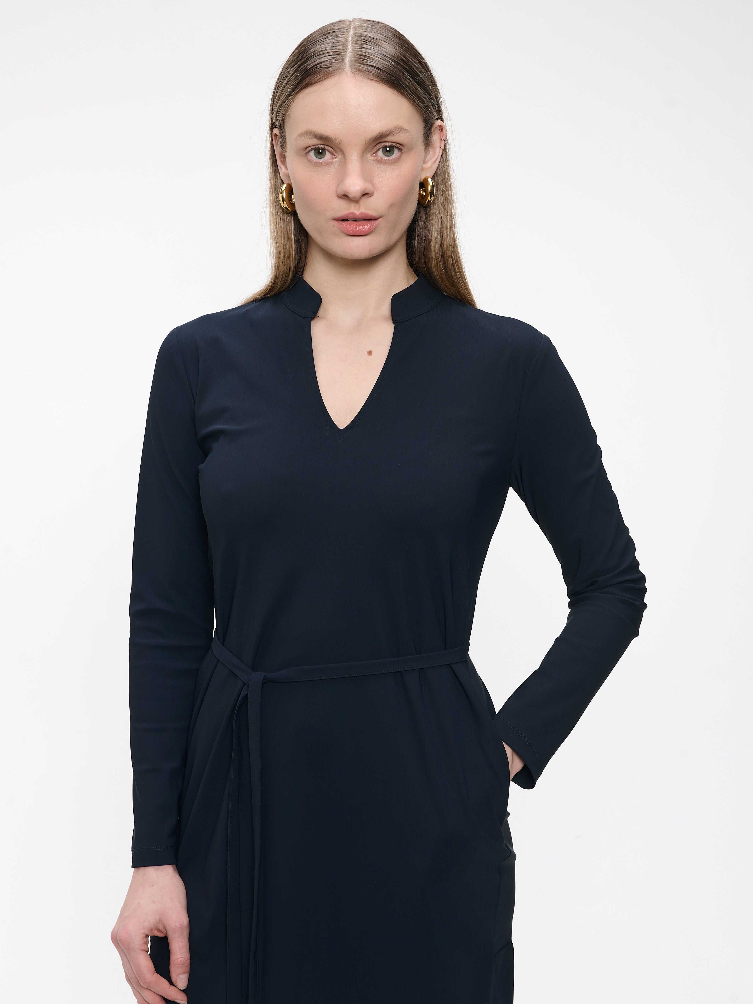 Mühelos schick – das Gerrie-Kleid ist dein idealer Begleiter für alltägliche Eleganz. Aus weichem technischem Jersey gefertigt, vereint dieses langärmlige Kleid Komfort mit Stil. Der schmeichelhafte V-Ausschnitt und der passende Taillengürtel betonen die feminine Silhouette, während die knielange Länge es vielseitig tragbar macht – perfekt für Büro und Freizeit.
