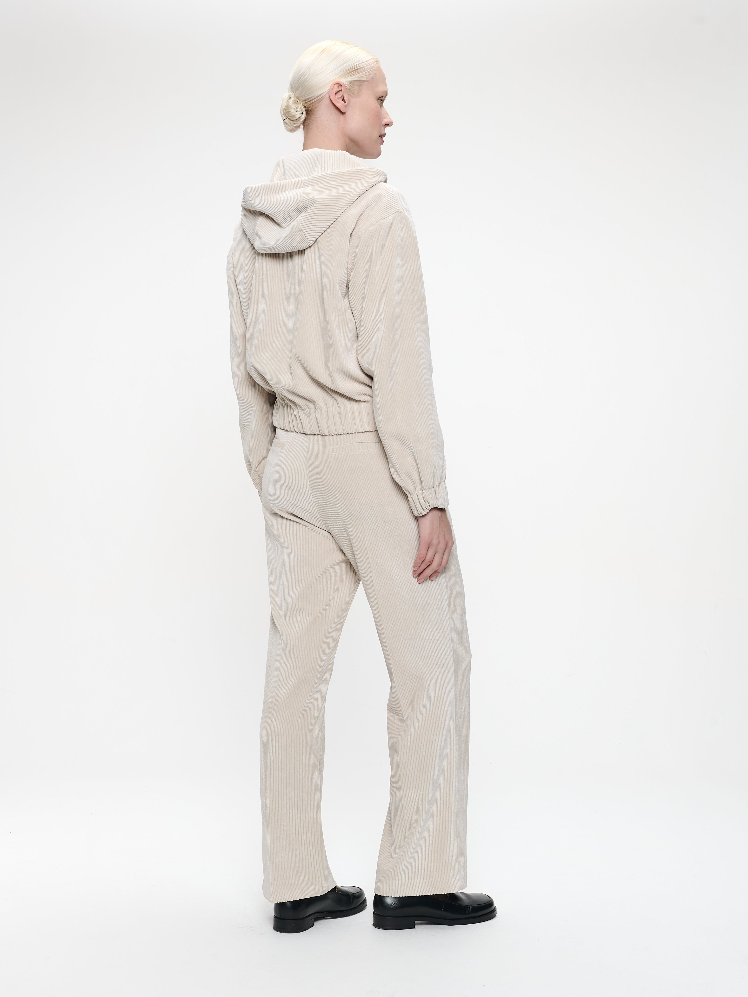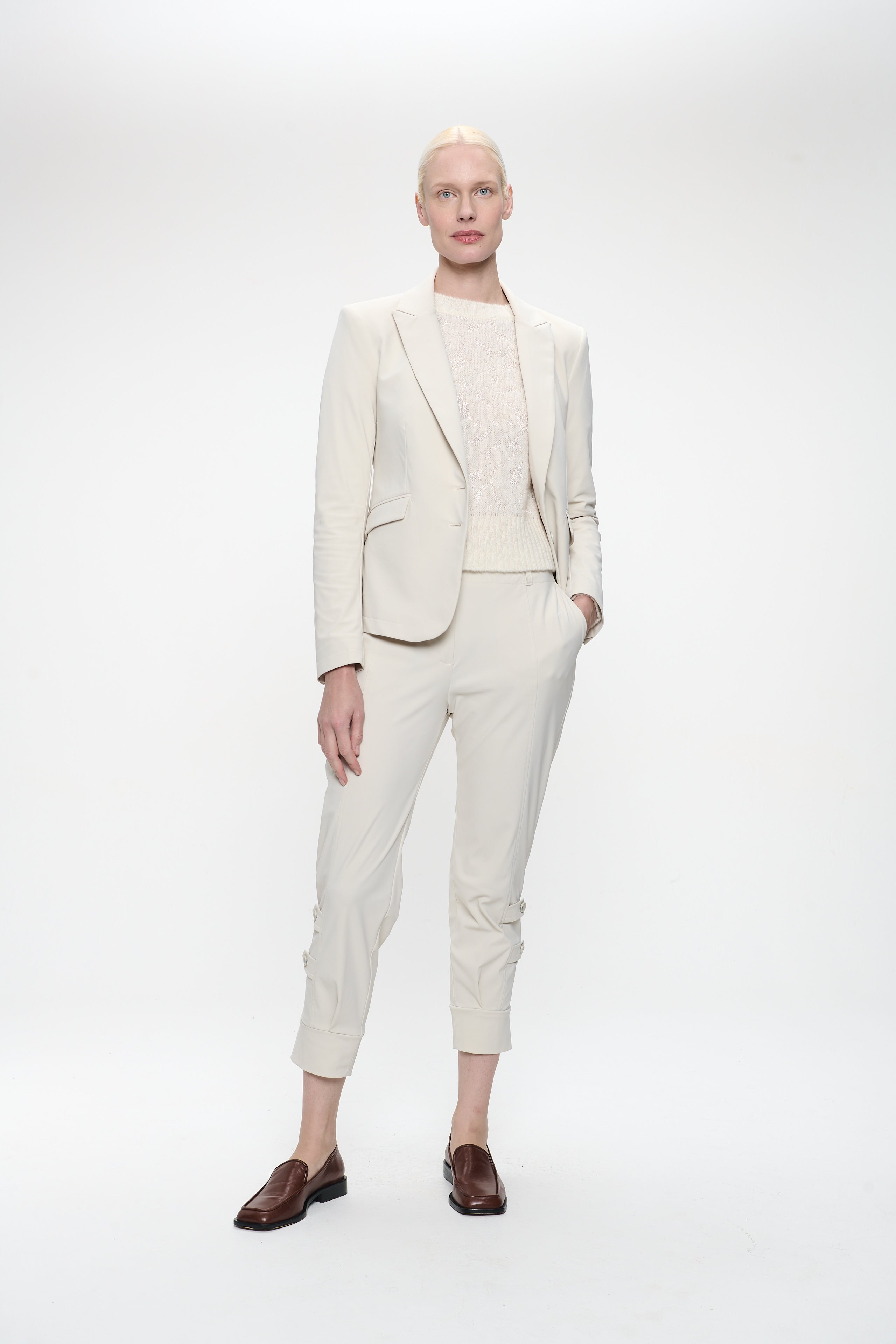 Die Delia Pants vereinen Eleganz und Komfort auf perfekte Weise. Sie bestehen aus gebürstetem technischem Jersey mit Wildleder-Optik und haben eine verkürzte, schmal zulaufende Passform mit dekorativen Knöpfen am Saum. Das raffinierte Design macht sie zu einem vielseitigen Kleidungsstück – ideal für Büro, Reisen oder abendliche Outfits.