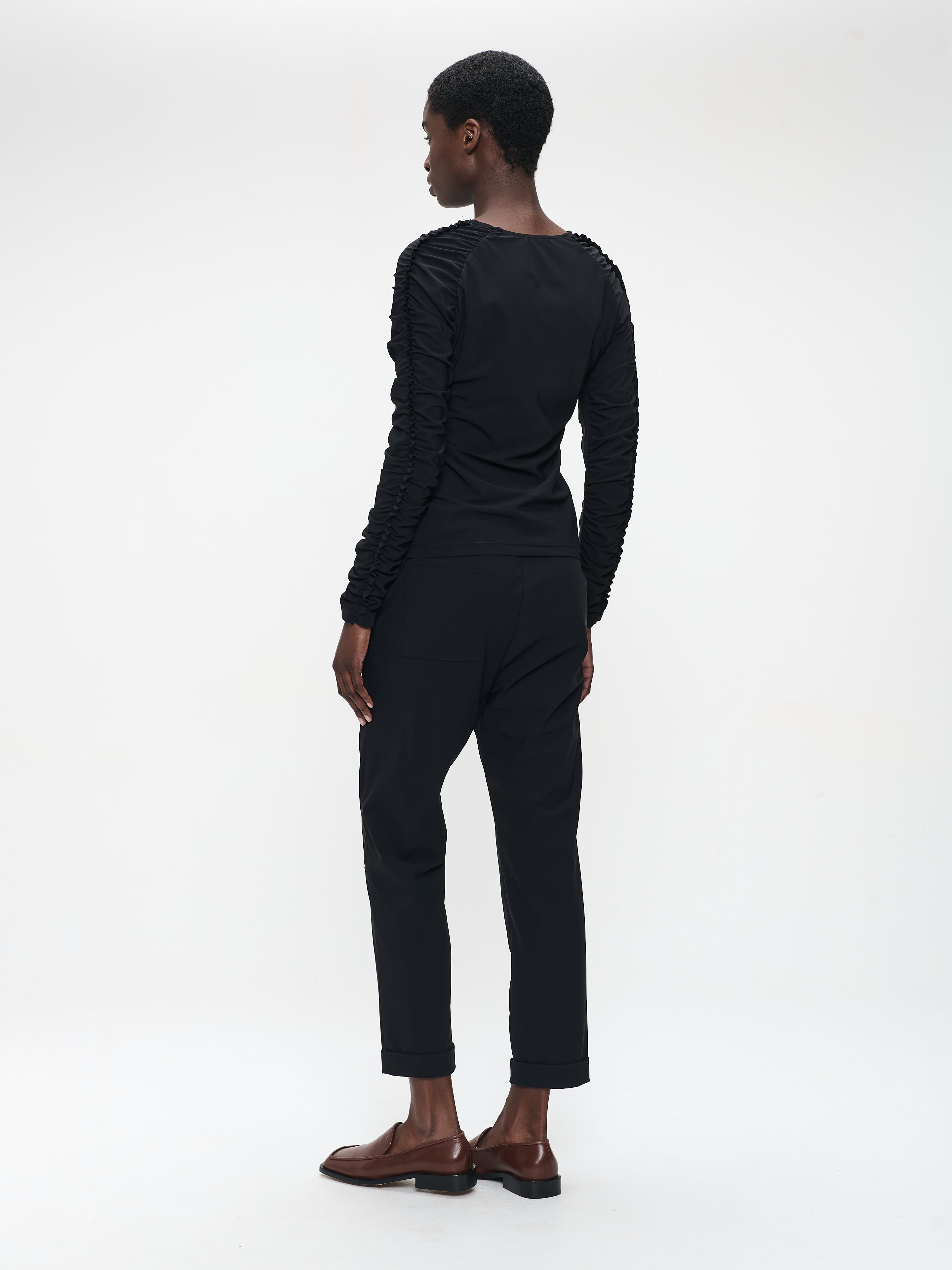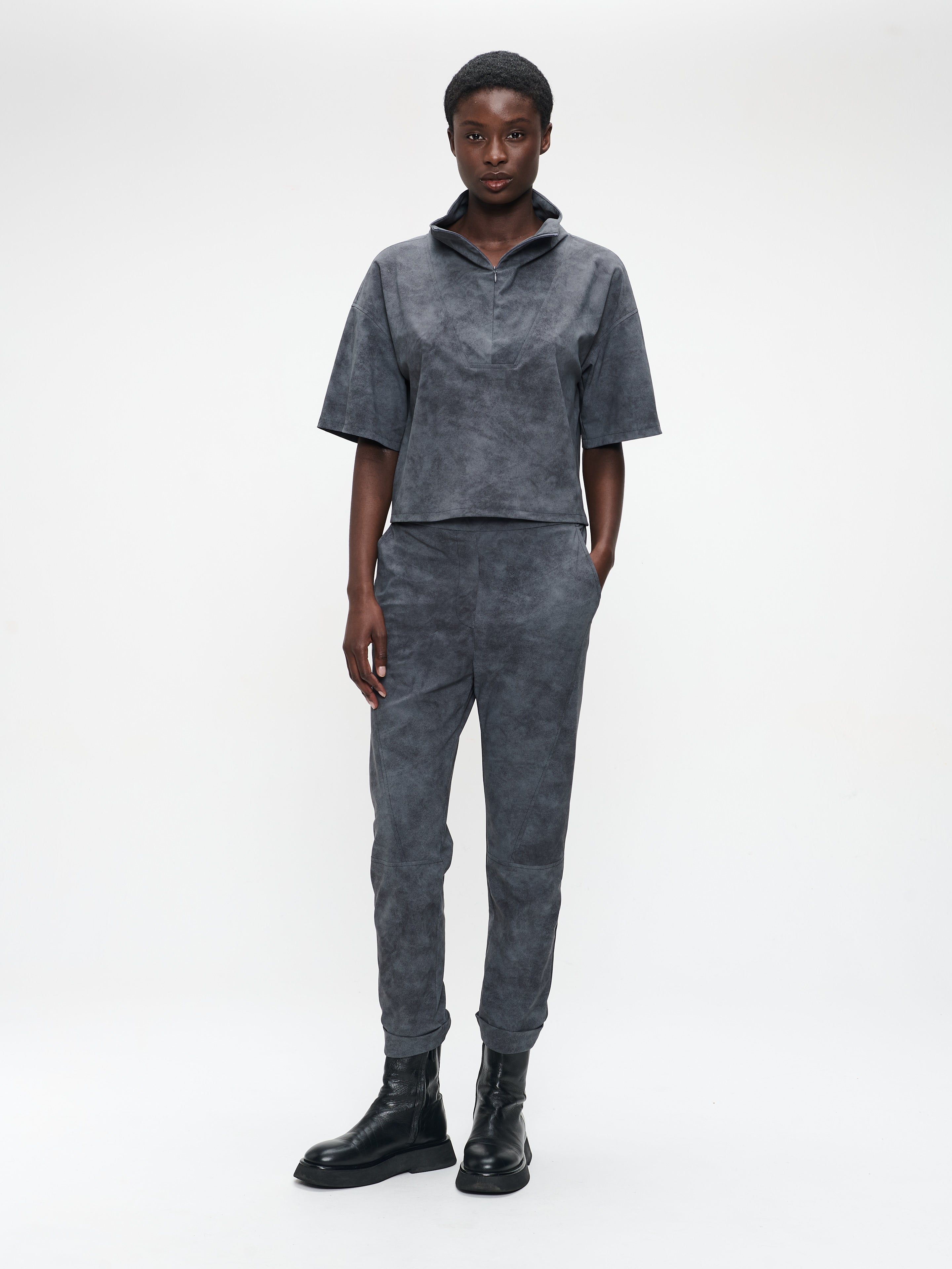 Die Daphne Pants bieten eine elegante Alternative zur Alltags-Hose. Sie sind aus weichem technischem Jersey mit Wildleder-Optik gefertigt und haben eine moderne, klare Silhouette mit verkürztem, schmal zulaufendem Bein und elastischem Bund. Umschläge am Saum verleihen eine lässige Raffinesse – perfekt für lässige oder elegante Looks.