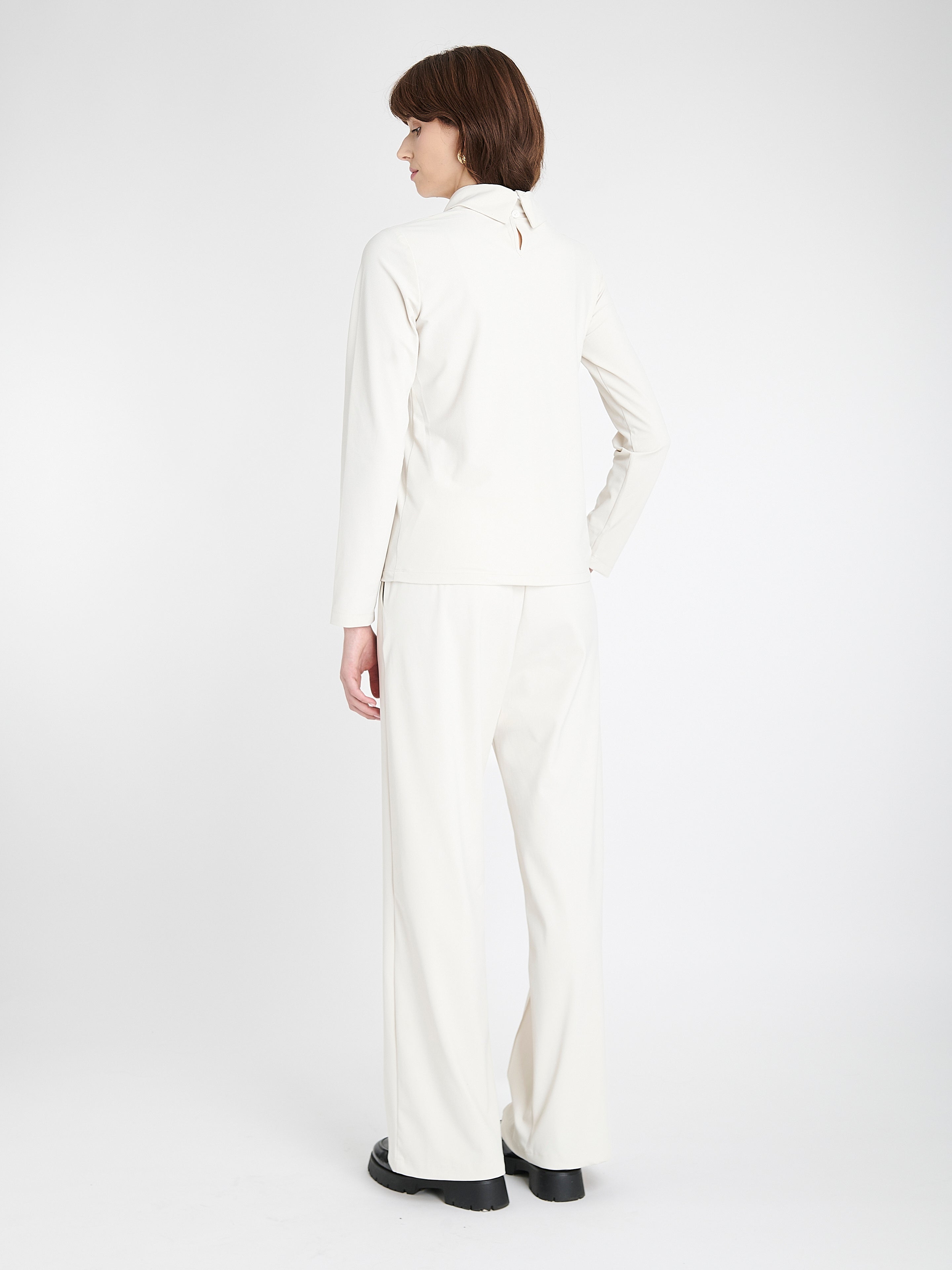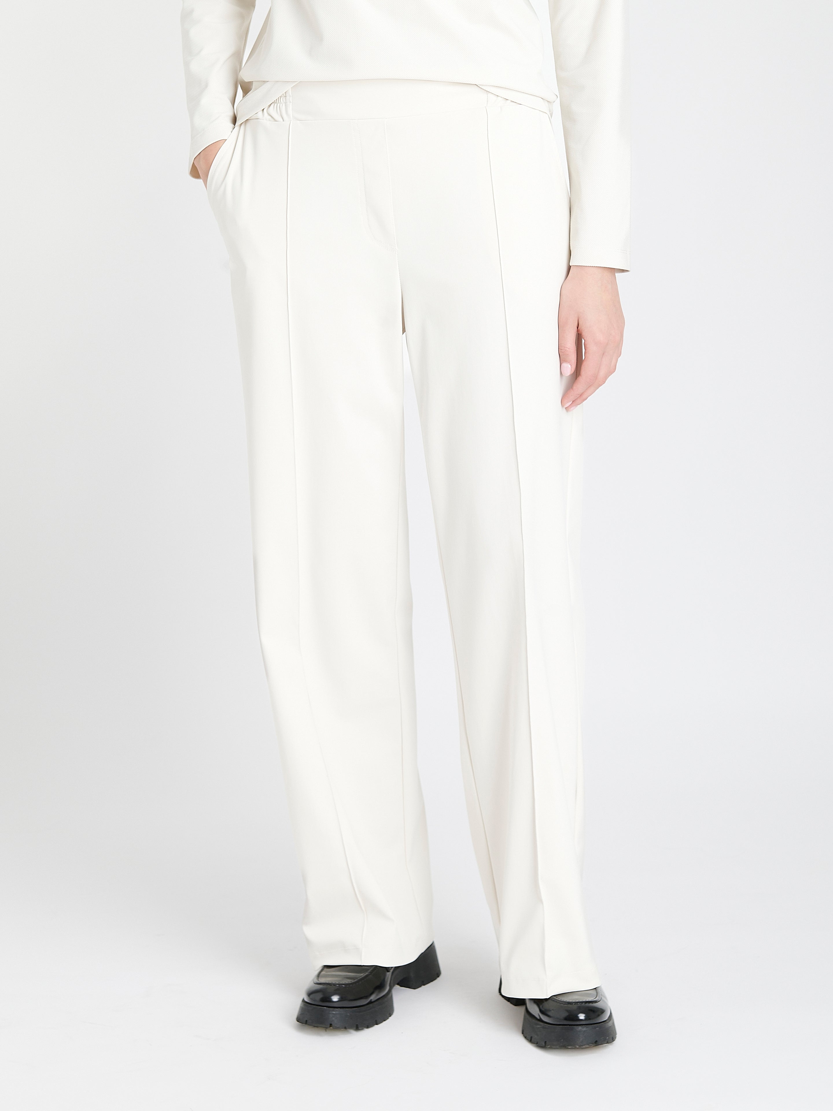 Die Thera Pants bieten eine raffinierte, fließende Silhouette – ideal für elegante Outfits mit hohem Tragekomfort. Aus gebürstetem technischem Jersey gefertigt, überzeugen sie mit weichem Fall, eleganten Falten vorne und weitem Bein. Perfekt kombinierbar mit Blazern oder Strickteilen für einen gehobenen Tages- bis Abendlook.