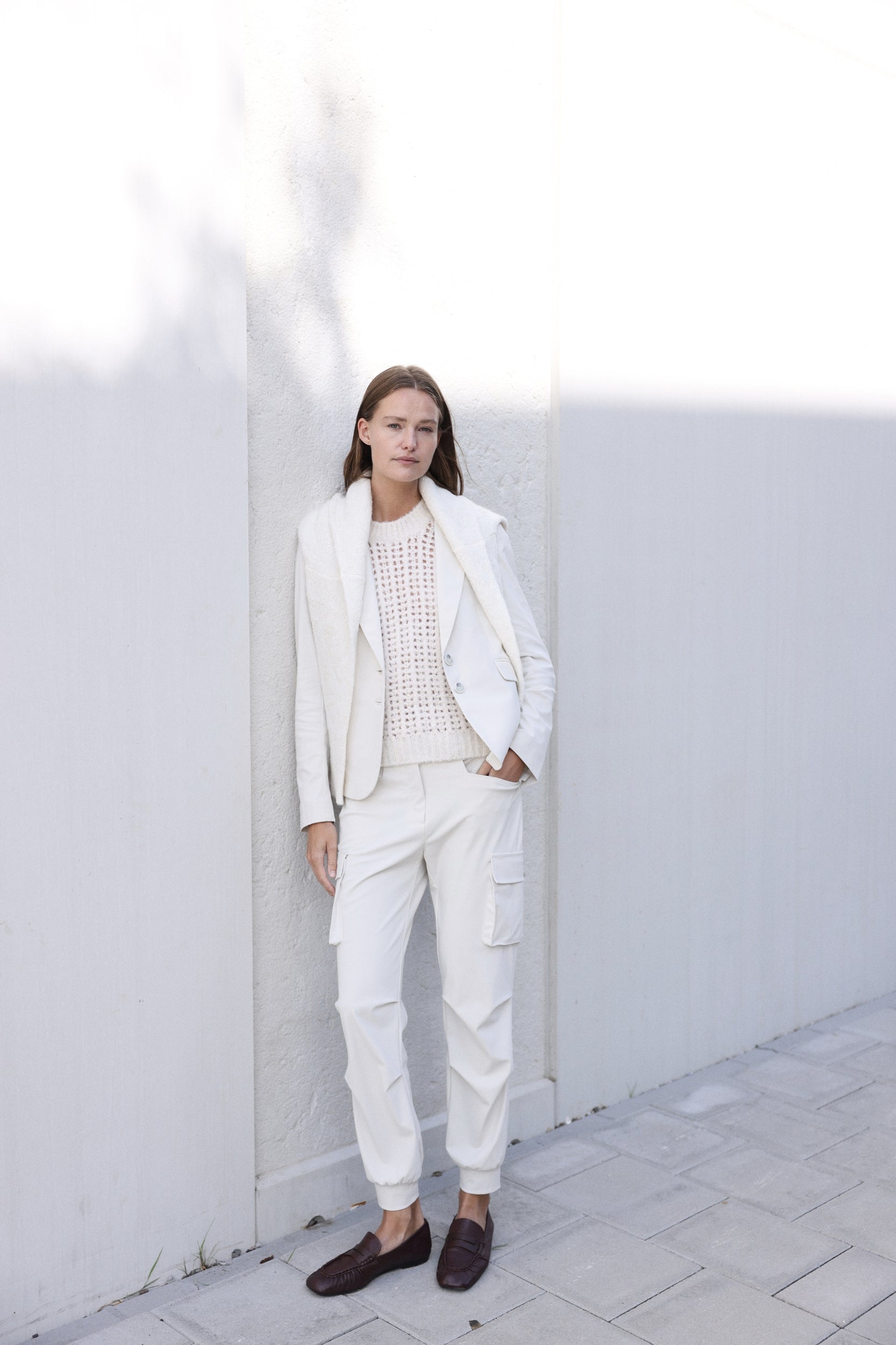 Mit seinem kastigen Schnitt und leicht verkürzter Länge passt er perfekt zu hochgeschnittenen Hosen oder Röcken. Der sanfte Off-White-Ton rundet jeden saisonalen Look stilvoll und gemütlich ab.