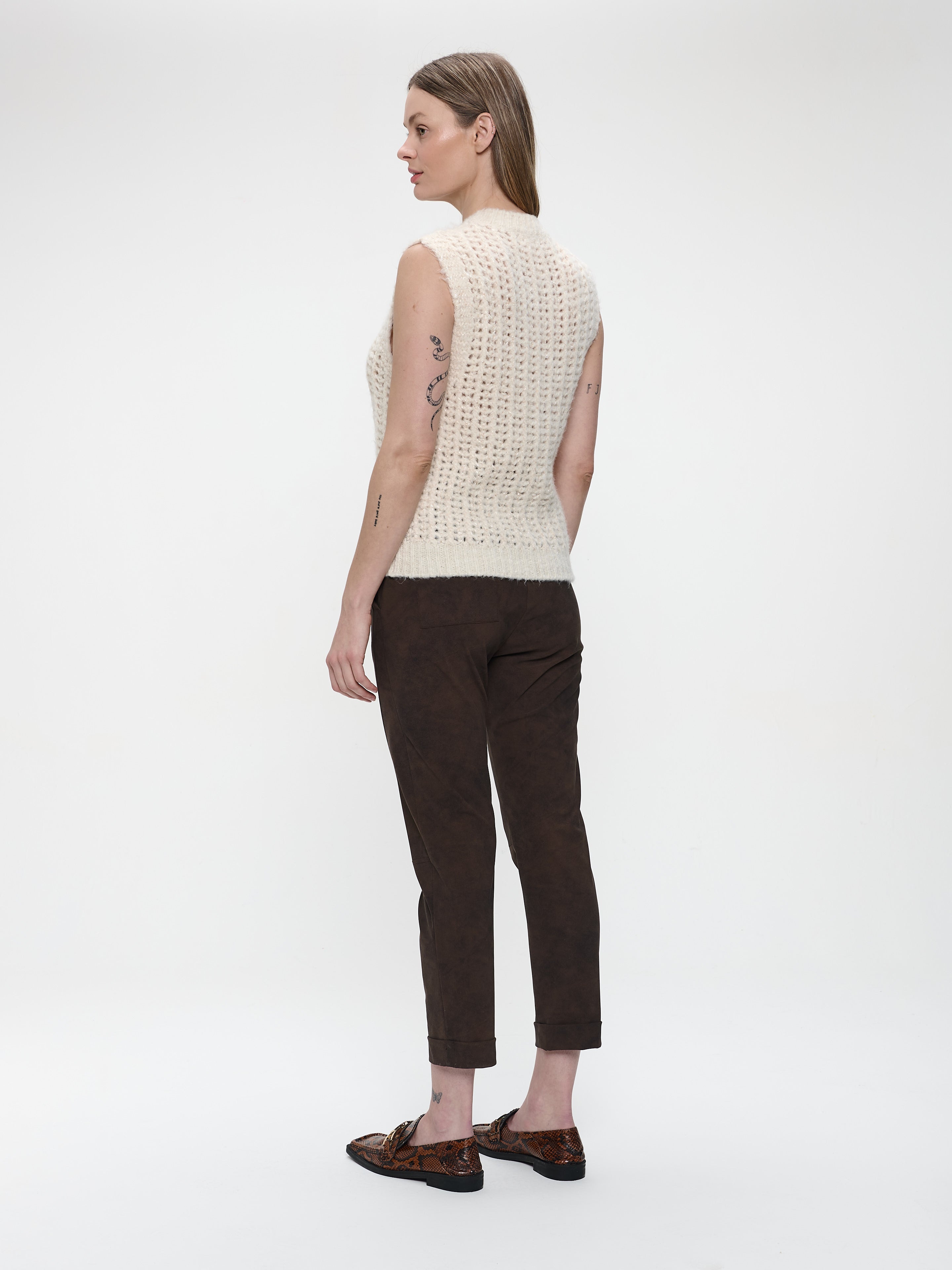 Die Shiny Vest 1008 von Jane Lushka ist ein leichtes und atmungsaktives Layering-Teil, ideal für den Übergang. Die offene Strickstruktur und ärmellose Silhouette verleihen ihr eine moderne Note, während der weiche Mix aus Wolle und Viskose ganztägigen Tragekomfort bietet. Trage sie solo oder über einer Bluse für einen schicken, zeitgemäßen Look.
