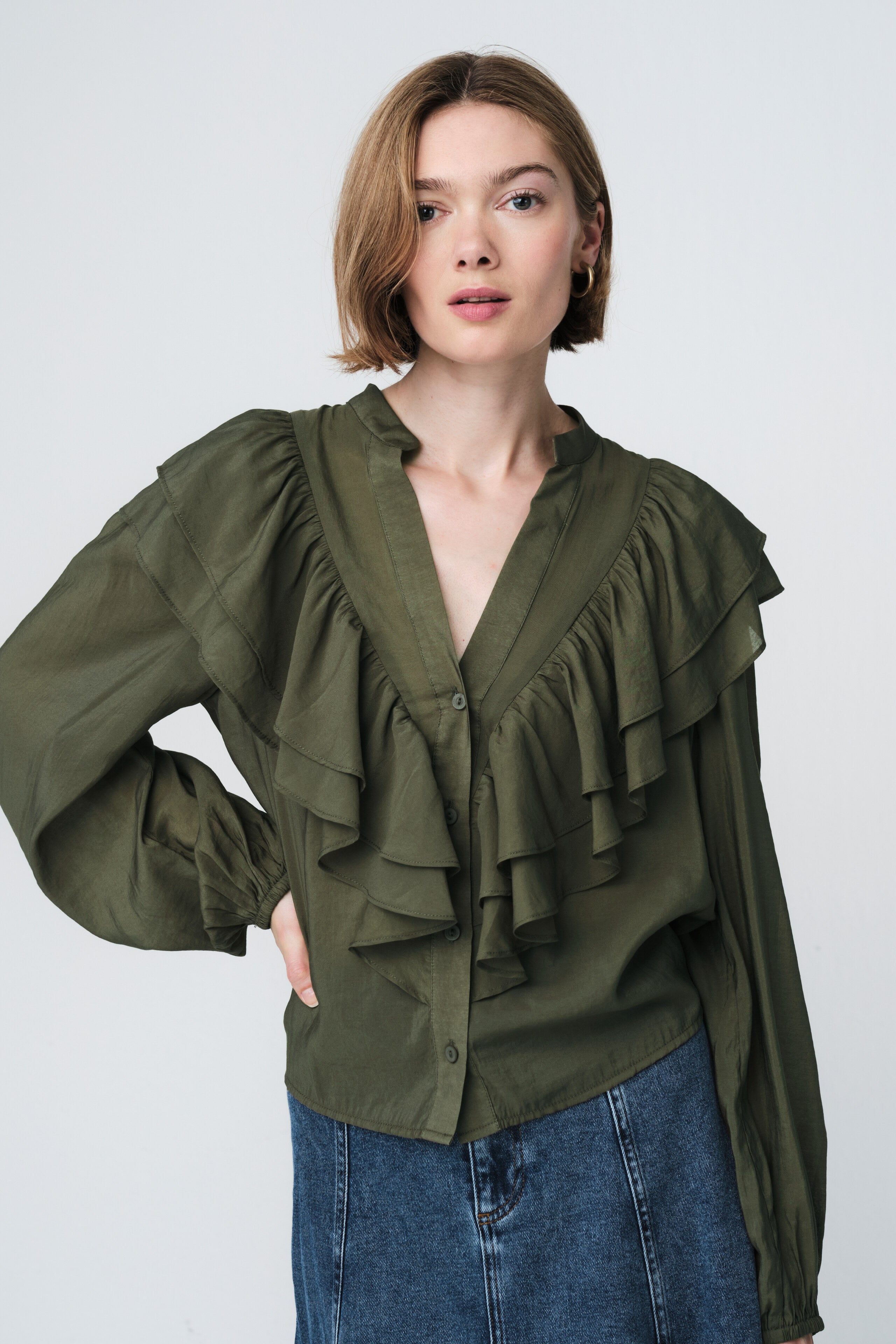 Die Beny Viscose Blouse ist ein romantisches und feminines Kleidungsstück aus einer weichen Viskosemischung. Mit den mehrlagigen Rüschen entlang des Ausschnitts und der Vorderseite verleiht sie jedem Outfit Eleganz und Bewegung. Die normale Passform und der fließende Stoff bieten Komfort und Stil zugleich. Perfekt kombinierbar mit High-Waist-Hosen oder Jeans für einen mühelos schicken Look.