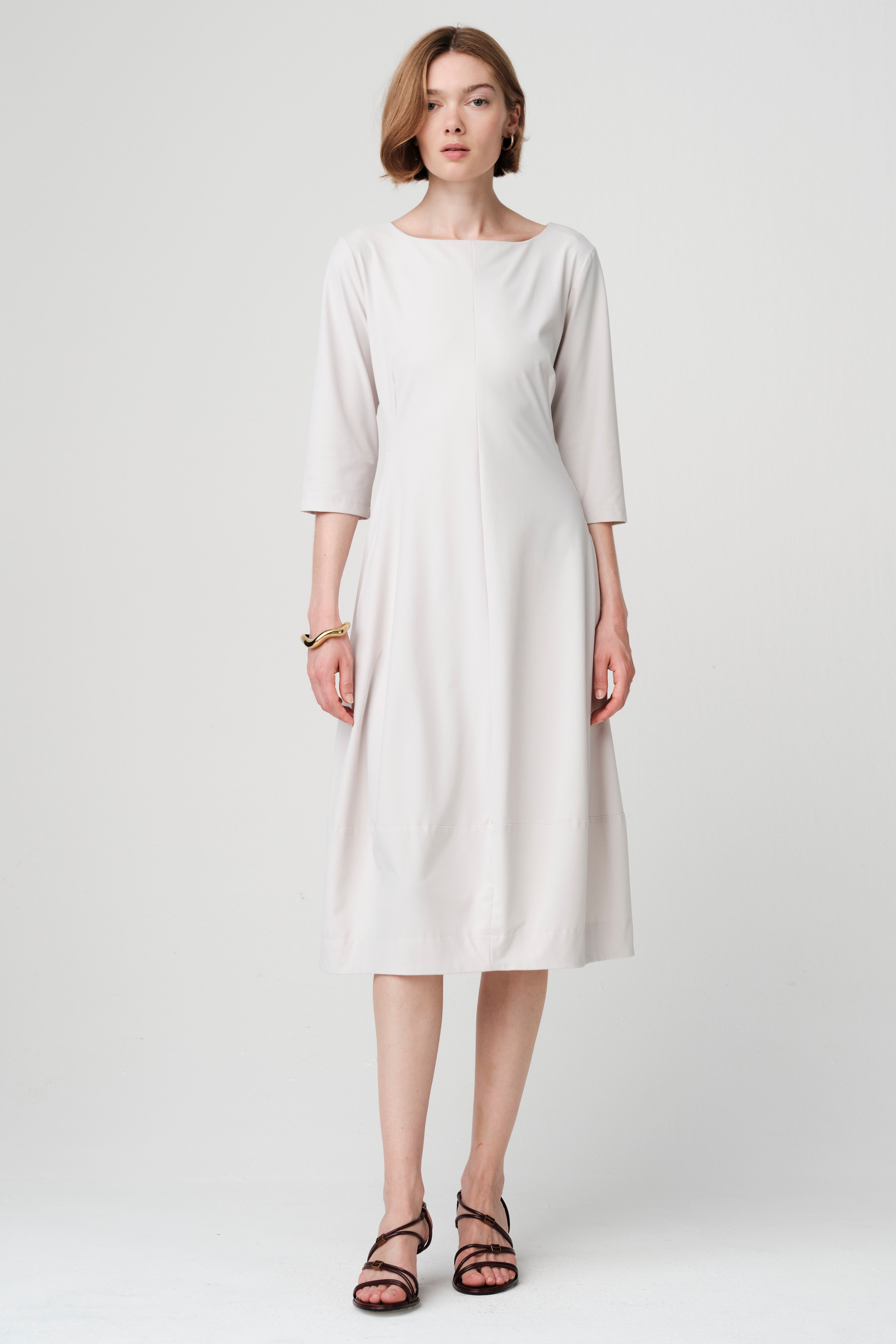 La robe Asola offre un équilibre parfait entre confort et élégance moderne. Confectionnée en Italie dans un jersey technique légèrement structuré, elle présente un col rond épuré et des manches 3/4 élégantes pour une silhouette raffinée. Sa coupe ample accompagne naturellement les mouvements, tandis que la taille subtilement dessinée et la longueur midi apportent fluidité et sophistication. Une pièce polyvalente et intemporelle, idéale au quotidien comme pour les occasions plus habillées.