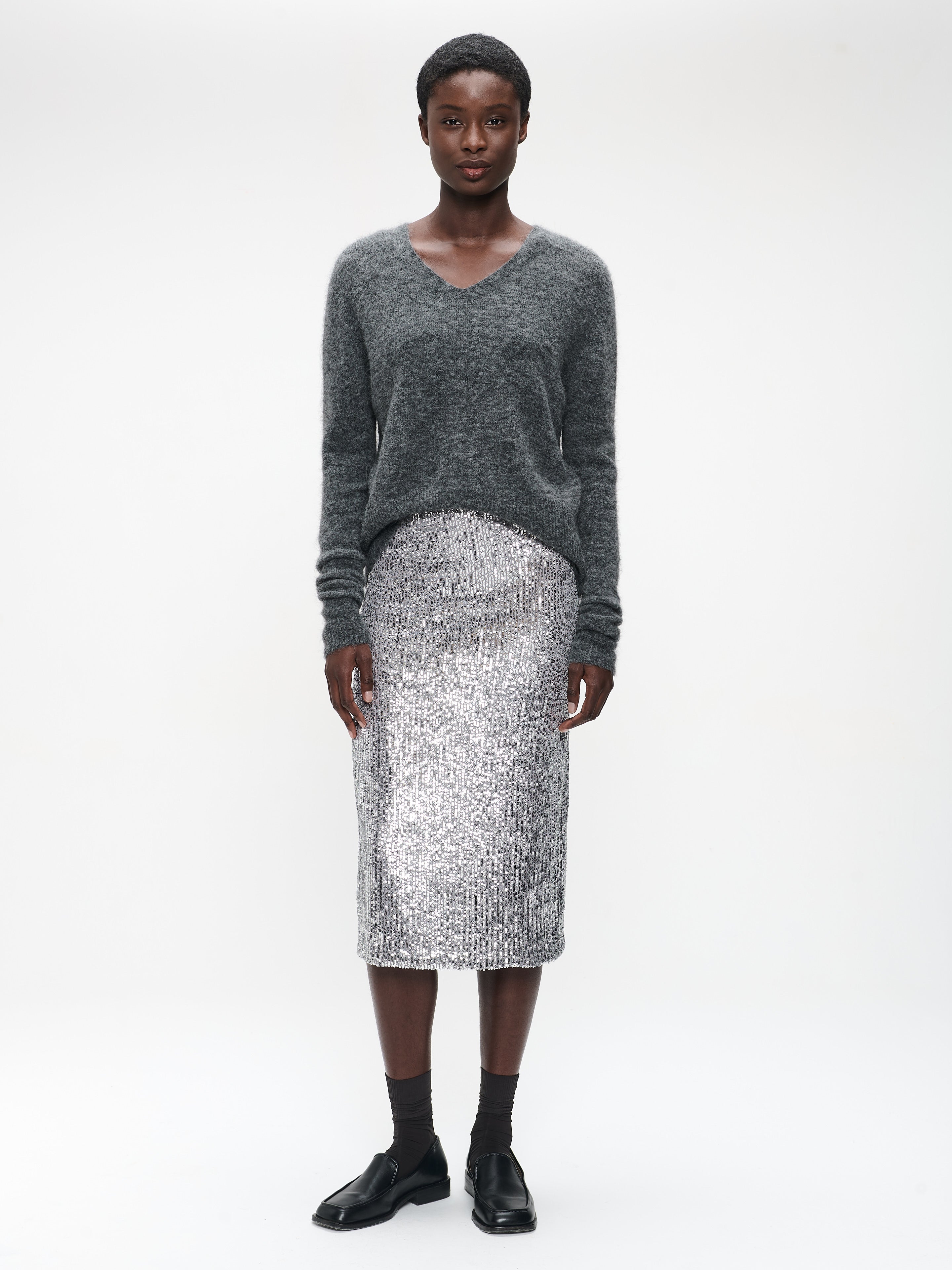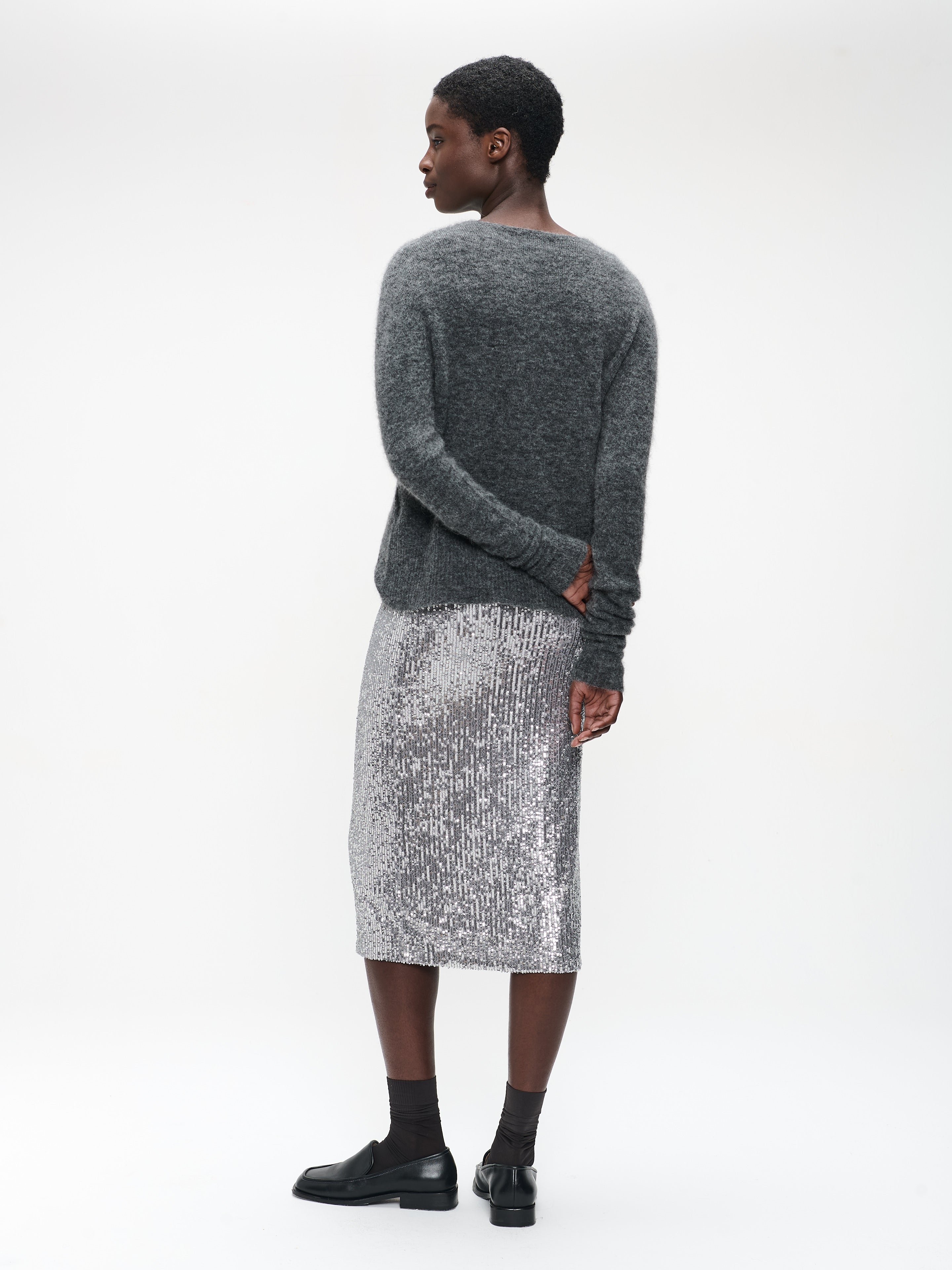 Ein raffinierter Stricktop, das feine Handwerkskunst mit modernem Flair verbindet. Mit einem Lochmuster, verziert mit dezenten Pailletten, bringt dieses Stück dezenten Glanz in Ihre Garderobe. Die halblangen Ärmel und der weiche Rundhalsausschnitt machen es perfekt zum Schichten oder Solo-Tragen.