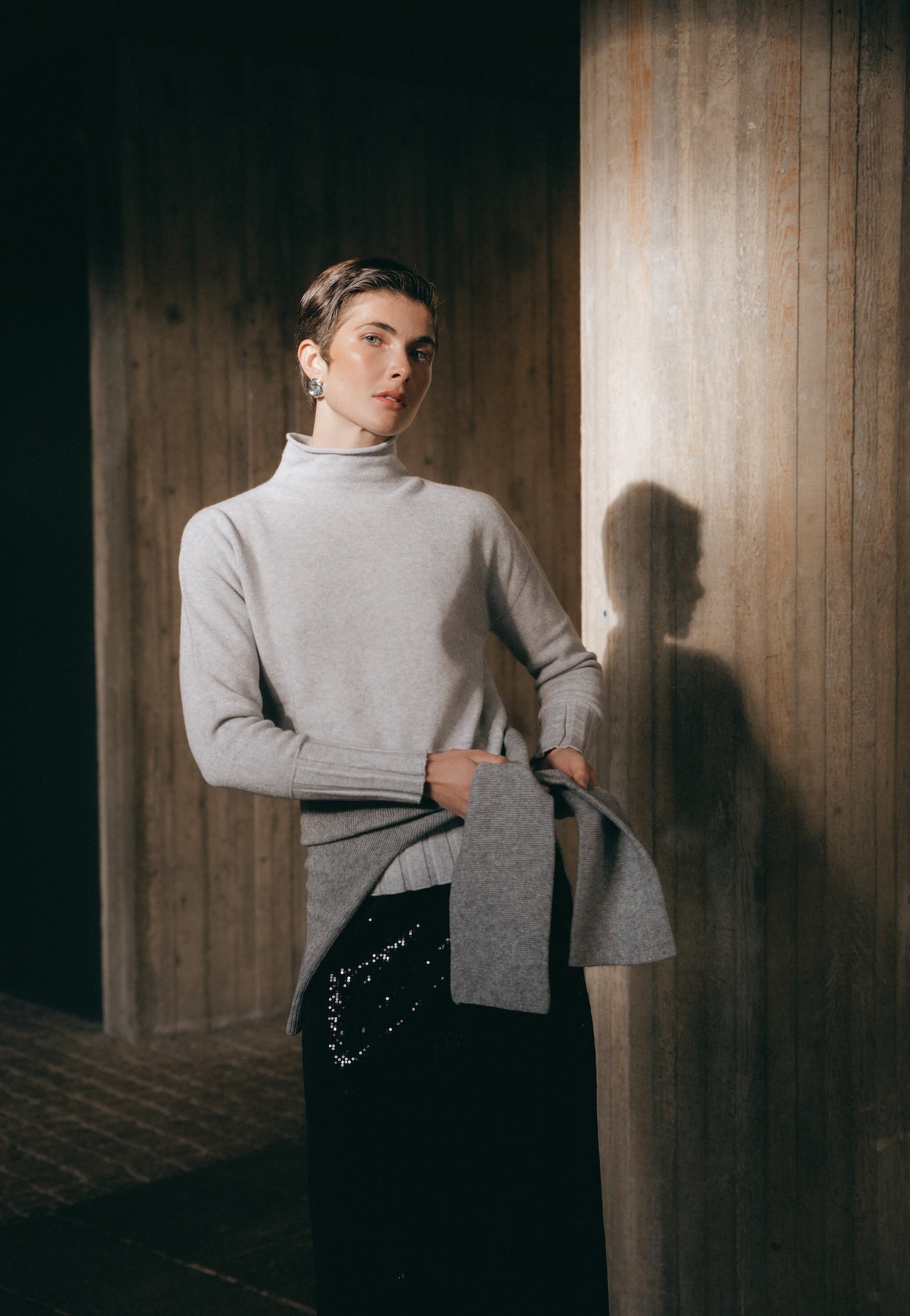 Dai una marcia in più alla tua maglieria con il Pullover seamless25578 – un capo essenziale minimalista ma lussuoso, realizzato in un pregiato mix di lana. Questo pullover presenta un design senza cuciture che offre una sensazione di seconda pelle, mentre il collo alto morbido aggiunge un tocco raffinato. Realizzato in una delicata tonalità di grigio, è perfetto per stratificazioni eleganti durante i mesi più freddi.