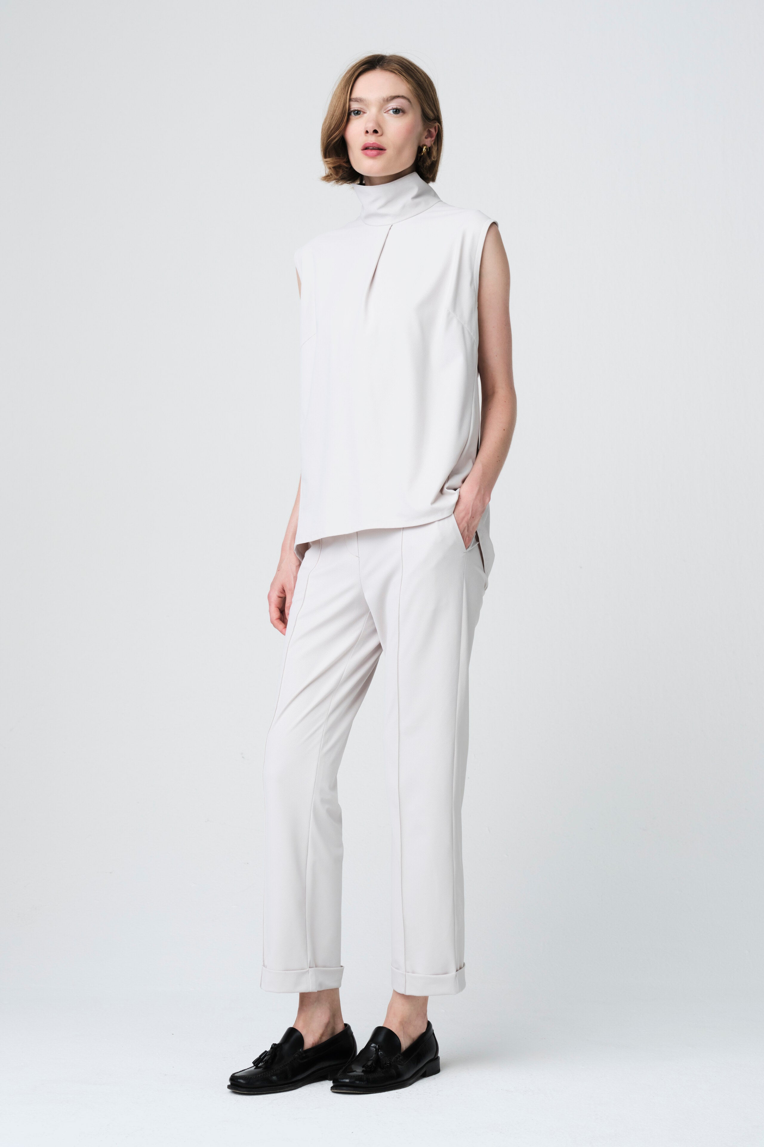 Il Dolche Vitas WS Stretch Tech Jersey Top di Jane Lushka è l’emblema dell’eleganza minimalista. Realizzato in Bulgaria in morbido tessuto tecnico elasticizzato, presenta un collo alto strutturato e una linea morbida e fluida che valorizza la figura. Perfetto per l’ufficio, i viaggi o un look quotidiano raffinato.