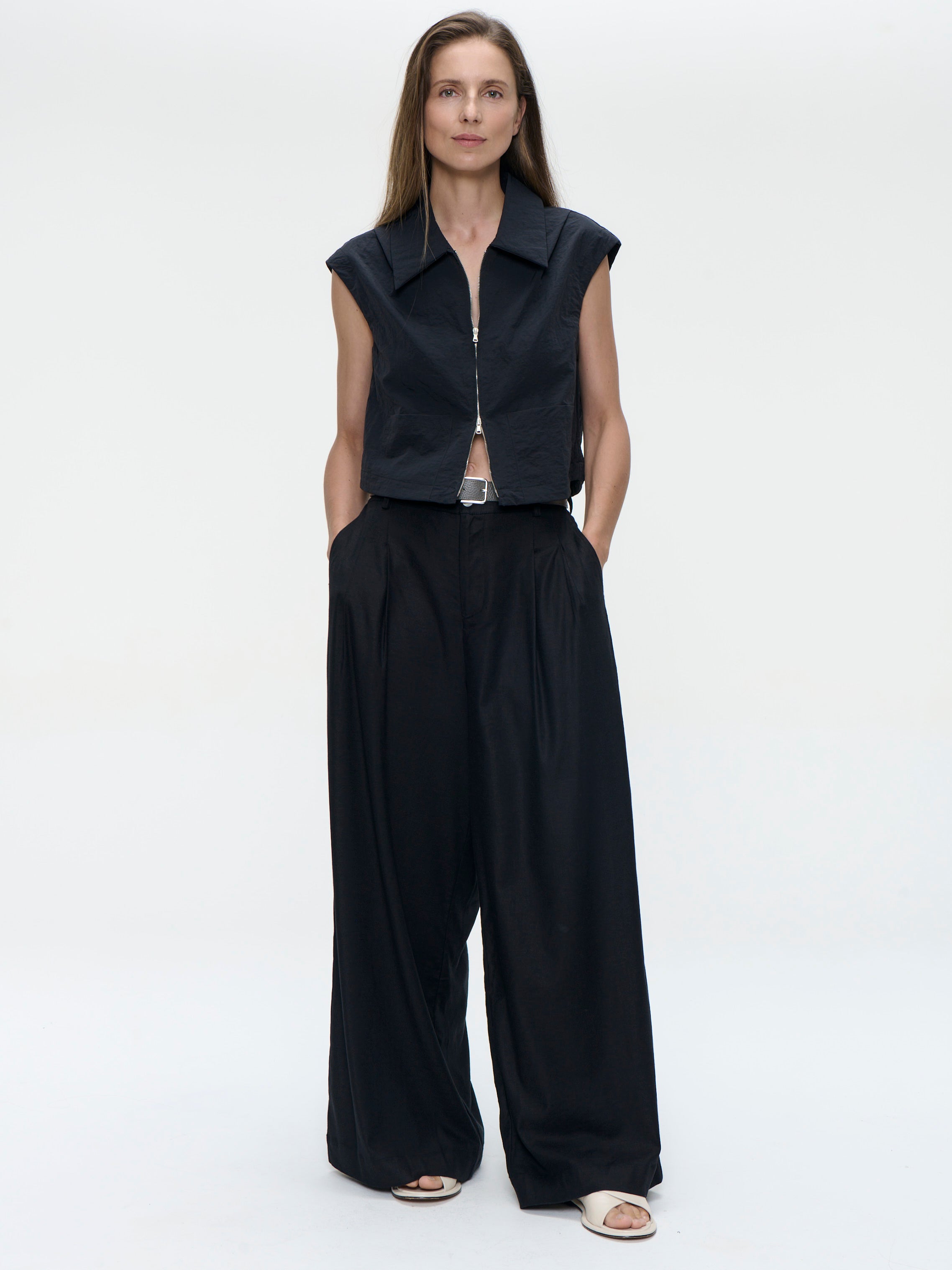 Entra nel mondo del minimalismo moderno con la Emiko Taffeta Jacket – un design senza maniche elegante che bilancia perfettamente struttura e leggerezza. Realizzata in taffetà di nylon leggero, presenta un taglio corto, colletto a punta e chiusura frontale con zip per un look pulito e contemporaneo. La vestibilità morbida garantisce comfort e versatilità, perfetta da abbinare a look casual o raffinati.