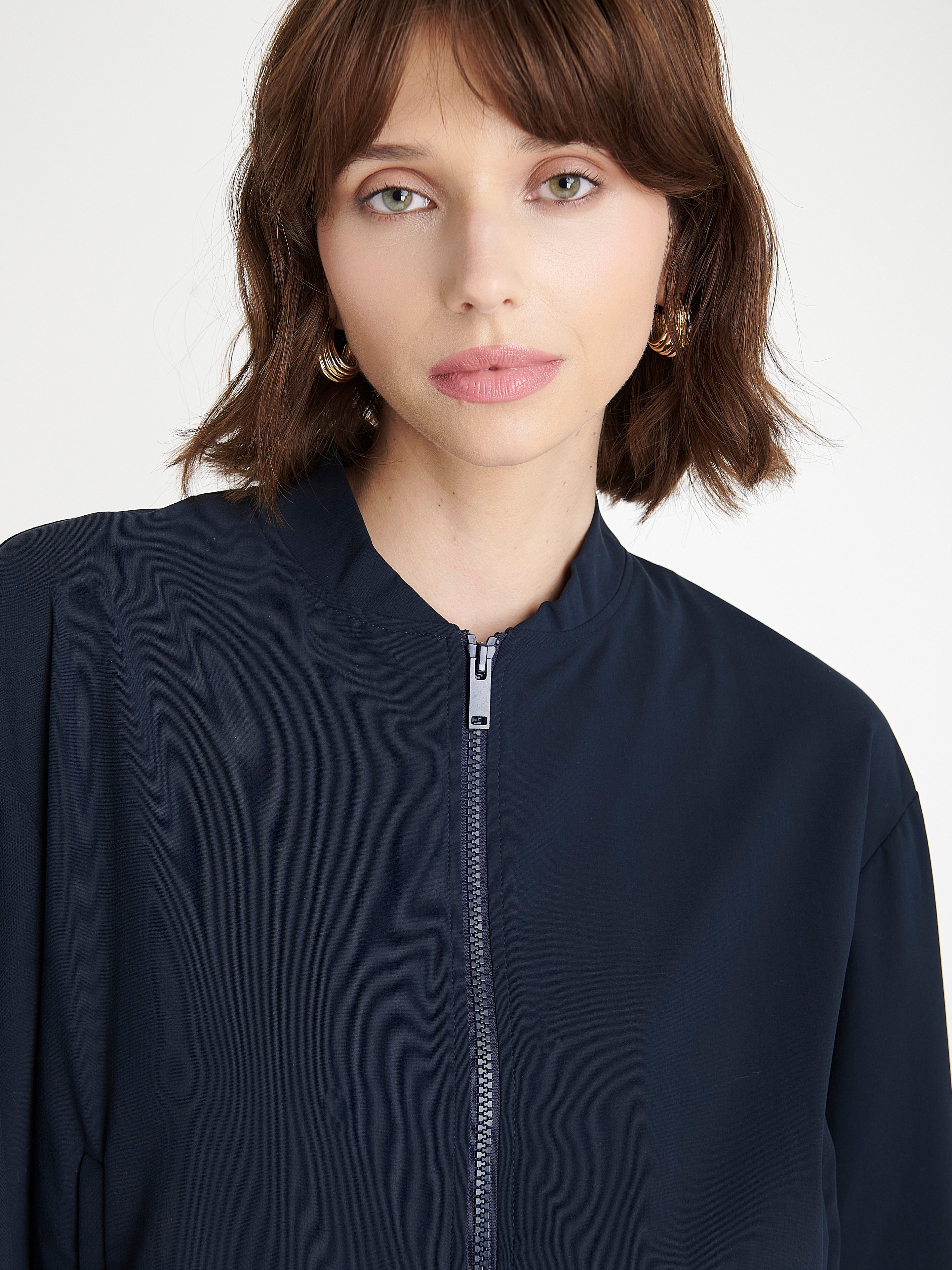 Realizzata in jersey tecnico spazzolato, presenta una superficie morbida e leggermente vellutata, per un effetto lussuoso ma pratico. Il colletto minimal, la zip frontale e i bordi elasticizzati donano una silhouette moderna e pulita. Perfetta con pantaloni coordinati o sopra un abito per uno stile semplice ma sofisticato.